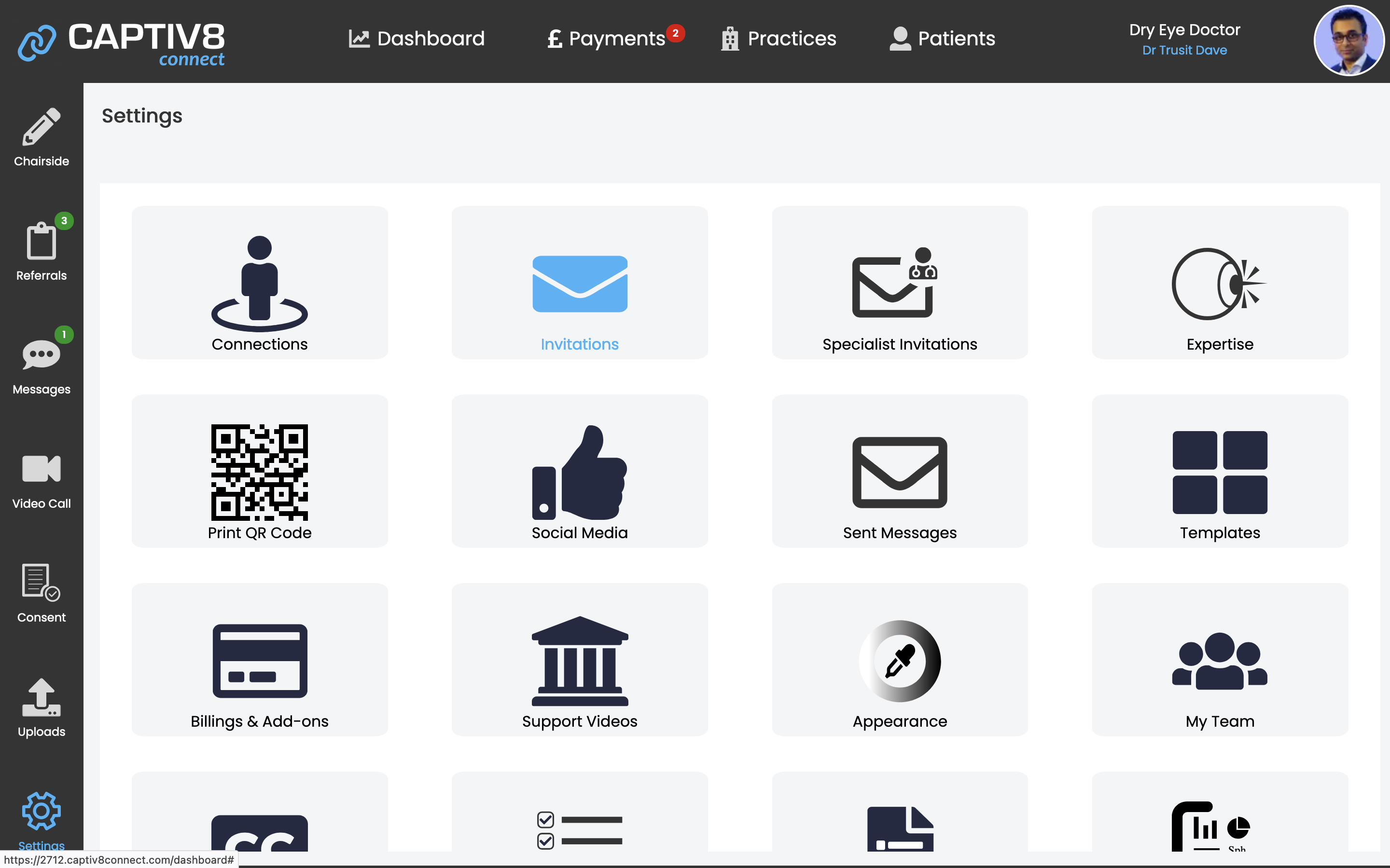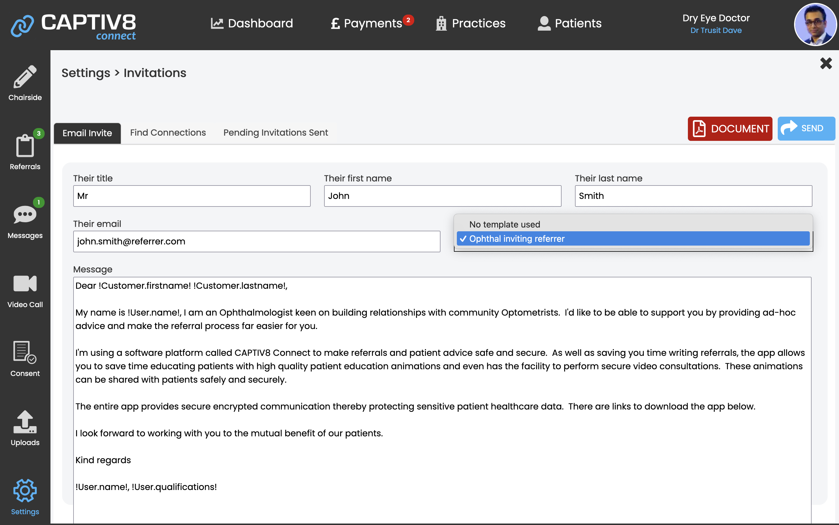 Goto Settings and then click InvitationsInvite a referrer by adding their details and selecting the invitation template message. Note this template message can also be customised by going to the Settings area and adding your own message in Templates. Once you have filled in the details, click the Send button.